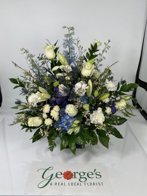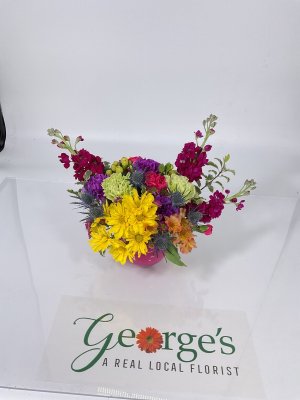 The online service and communication were wonderful. The flower arrangement was beautiful and as expected in size and colors and dynamics. I love the added service of sending a picture of the flower arrangement when completed. Thank you, George's Flowers.