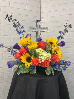 Little week on the purple stems, must have ran out. Could have added more greenery to fill in ….. but thank you for getting it to the church. Kathy