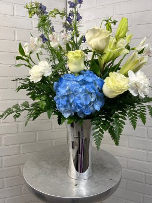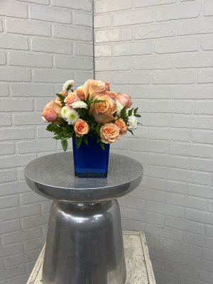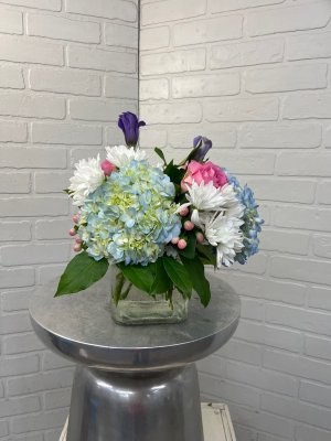 This is VERY disappointing. I bought an arrangement when roses and hydrangeas. Substituting the small carnation-looking flowers is disappointing. Also the use of the cobalt vase with the color of flowers was not in the original picture and does not look good. This is my first time to order from you and may be my last.