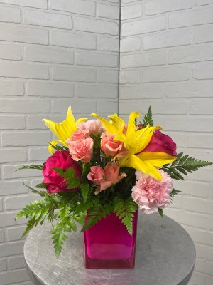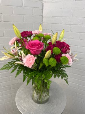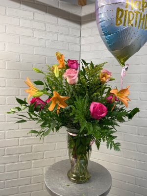 Hello Shirley, I am sorry you are unable to see in the picture but there are some open lily blooms. We design using the recipe of the gift you chose. The vase includes hot pink roses, green button ... More