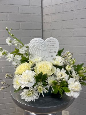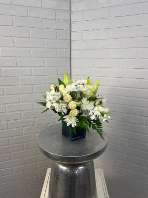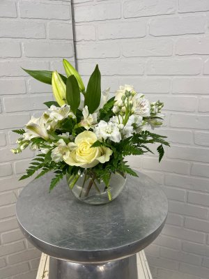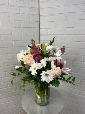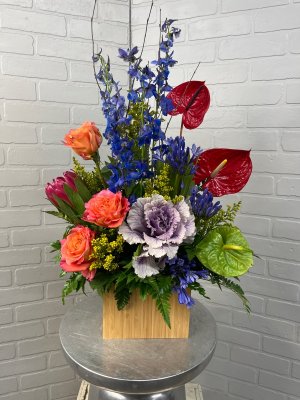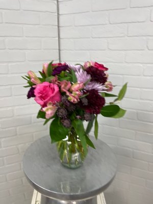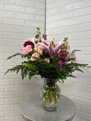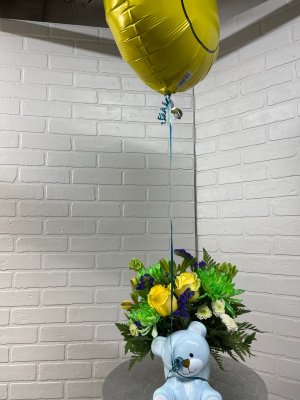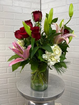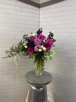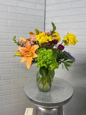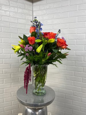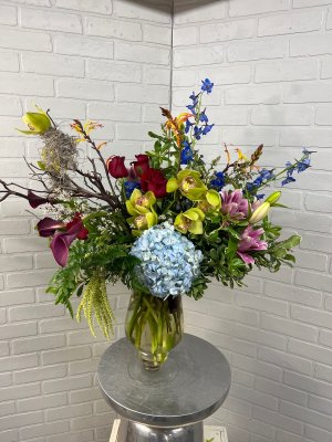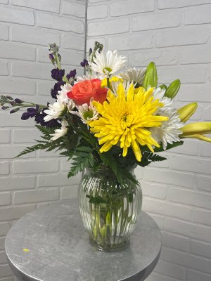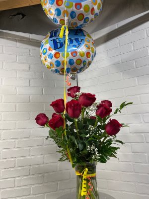 Left this TALL arrangement WITH A BALLOON OUTSIDE MY DOOR ON A WINDY DAY! Not surprising that was blown over & vase shattered all over sidewalk. I picked-up remains as carefully as possible but broken glass dropped from among the flowers when I brought inside & then shattered more, this time inside my apartment. Really no excuse. Your service getting steadily worse since leaving Camp Bowie location.
