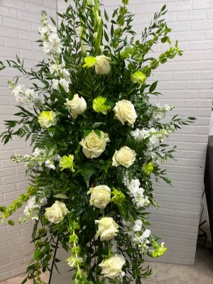 I apologize for the terrible picture. It is taken at a bad angle. I is filled to recipe with the 2 large roses and spray roses. Unfortunately, the spray roses are not shown in the picture sent to you.