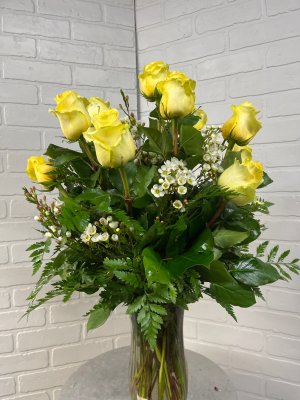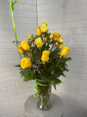 The first picture that you sent me was awful. I asked for yellow roses and an assortment of bright colored flowers. There was white and a dull purple color in it along with two/three yellow roses. All of it was overpowered by a bunch of cheap leather leaf. I paid $95 for that and found it cheap and unacceptable. When I called to complain, the employee just asked if I wanted yellow roses. Since I couldn't make him understand that I wanted a bright colored arrangement with yellow roses, I settled. This yellow bouquet is not what I wanted nor like, but it's what was sent. I do appreciate it being changed from the first bouquet though. It's very disappointing that is what $95 gets you.