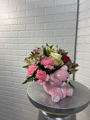 It's pretty. Wishing for some ribbon. Are the hydrangeas fresh? I am so disappointed. Did not get what I asked for the the quality looks poor.