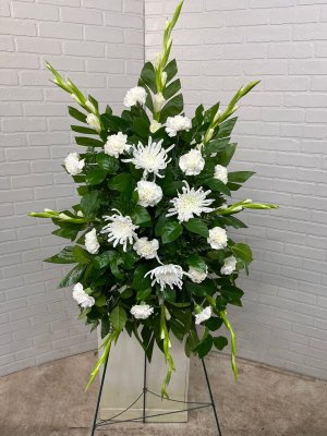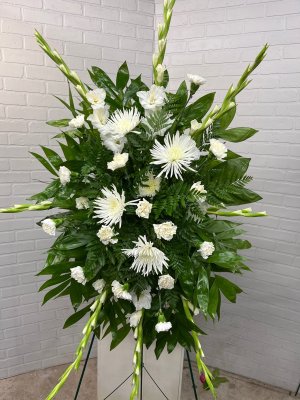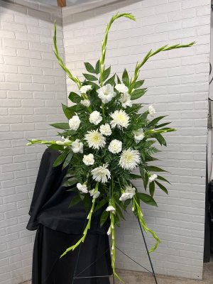 It is cut off. For $108 total, I hope there is some white flowers at the top. It's my favorite classy funeral arrangement I always send. I appreciate getting a photo tremendously but, very disappointed it being chopped off where you can't see the most important part! I'm out of state and apparently the Gordon Boswell close to her must be closed, so had an $18 delivery charge. That too was unexpected. Should use ftd like someone who lives states away from everyone in her circle. Was trying to support local businesses.