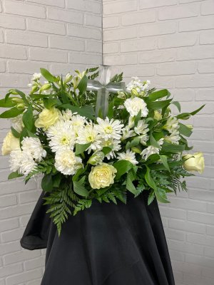 Its very pretty and festive and a nice, large size. We would have appreciated more flowers as it's almost all greens. Thank you for sending a picture!