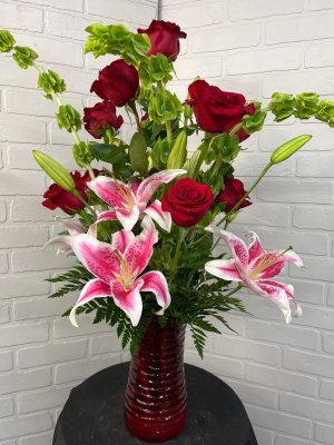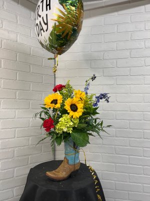 THANK YOU!! These flowers made her day. Our friend Debbie ordered a boot filled with flowers from you the other day for Karen. That's why I chose you. It's hard to know who to trust when you are out of town. She told me though that she only had them one day and the sunflowers were already wilting. I'm hoping mine will last longer than that. These roses are beautiful. I really appreciate when I get a photo of the arrangement! Thanks again!