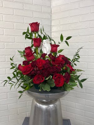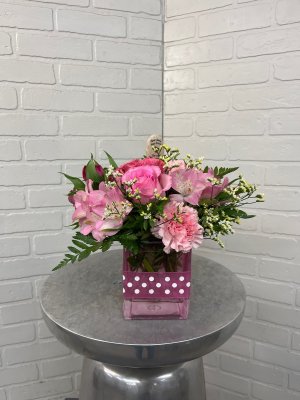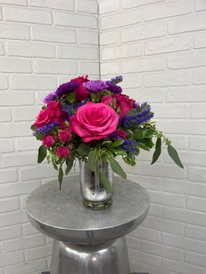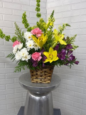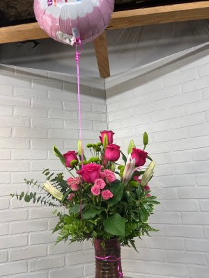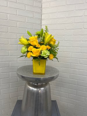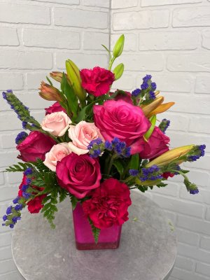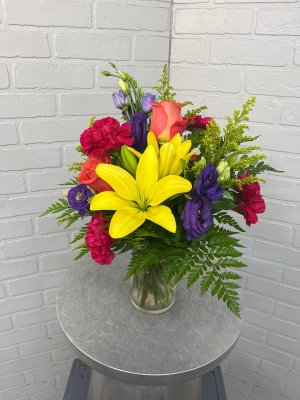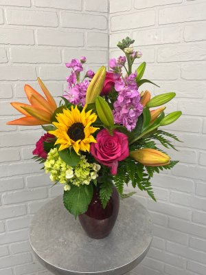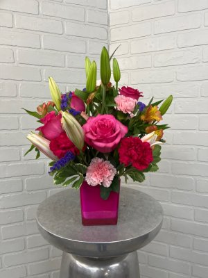 Very nice arrangement and I am very happy with it. I was a little disappointed that the fairy roses were not trimmed properly at the bottom and dried out by the second day. The lilies were not opened upon arrival but opened beautifully the next day. I would have preferred less greenery at the bottom of the arrangement by mixing in dianthus or even babys breath but to be fair, I should have custom ordered the arrangement for that. Great presentation, perfect delivery. Will definitely order again!