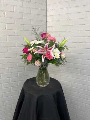 Very pretty arrangement. Bright but simple too. Just what I had in mind. Thank you.
