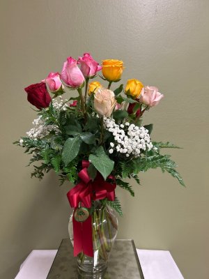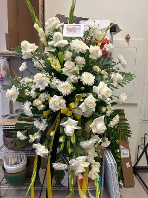 The mixed up on the red ribbon was a mistake and it was fixed, thankfully. I have shared the corrected photo with several of the fraternity brothers and gotten feedback from them. We are disappointed with the arrangement. There appear to be only 12 white roses and they are all open and look old. We expected more for $500. Jim Meyer