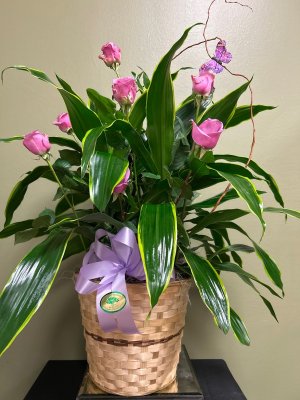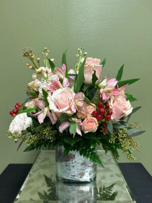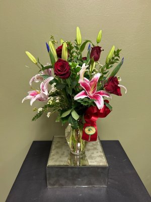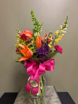 Absolutely Gorgeous! I Love, Love, Love this spring bouquet with the 6 stunning and large pinkish orange roses, the big beautiful gerber daisy, fresh magenta carnations, yellow lilies, and neat pink berry blossoms! Thank you very much!
