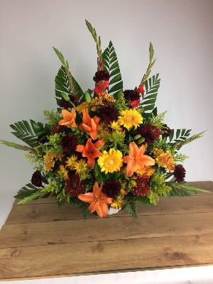I was disappointed. I asked for spring-like flowers and a design that would not be funereal. The colors are anything but springlike. The glads are nothing but funereal.