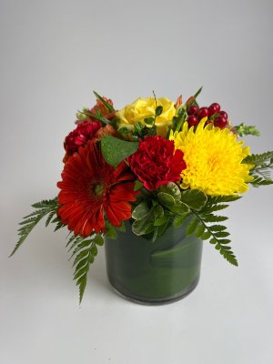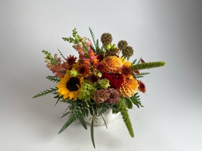 We absolutely love the flavor arrangement you created! Its color palette, shape, and impression are perfect for the time of year, and for a heartfelt birthday celebration. The service and delivery timing were excellent as well. We have always counted on Karin's to provide a floral masterpiece for the occasion, and are always delighted with your artistry and service. Thank you!