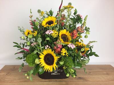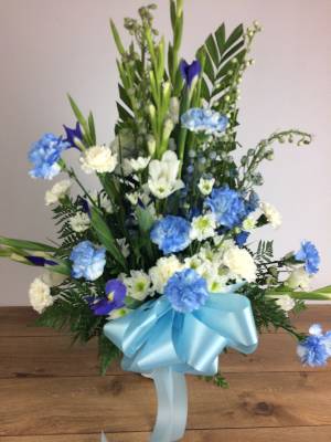I did not find the writing on the basket appropriate for a funeral. The arrangement was put in a plain basket and was absolutely beautiful. It was how I originally invisioned it. Terri was a tremendous help throughout the process.