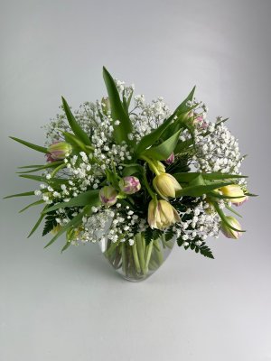 Disappointed as I ordered two dozen tulips but it appears that I only got a dozen and tons of baby breath. Am happy with the photo and the service.