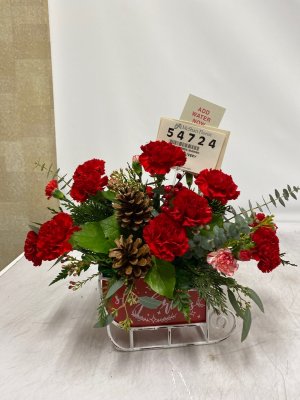 Carnations are somewhat sparse and hidden behind the banner. Maybe bring carnations out from behind the banner.   Thanks