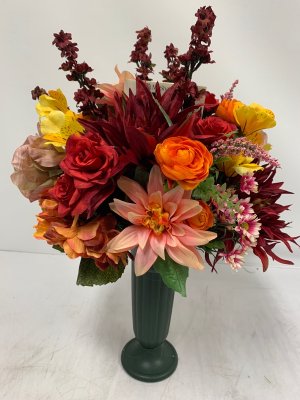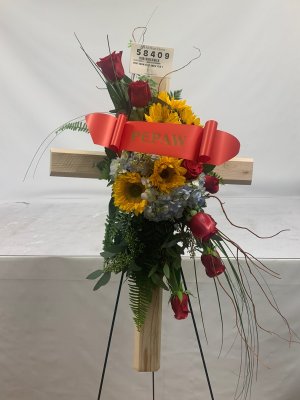 I am not picky and McShan arrangements are always beautiful and that's why I ordered from you, but I'm  not extremely happy with this arrangement.  It looks more bare and lopsided than I would expect.  I also highly dislike the orange ribbon …the color and that it covers the few flowers on the arrangement.  Does it match anything in the floral design?  I'm disappointed because this is my children's arrangement for their grandfather. I'm sorry, but it doesn't look like what expected.  I feel it needs just a few more flowers on the left because with the banner, it  looks unbalanced to me.