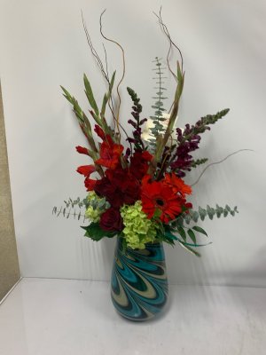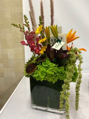 Flowers looked squished and whole arrangement looked shabby.  I was very disappointed especially since it went to my boss and also because I don't expect this from McShan.