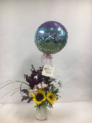 Thanks for the photo. First impression: perhaps a smaller balloon would not dwarf the flower arrangement so much. But I'm sure the recipient will like it.