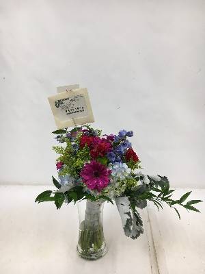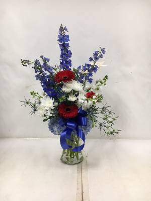 This arrangement wasn't as large as I'd hoped for $90.00 total, (and in town). The blue flowers were a nice addition, as I'd been told it would be red & white only with a blue bow.