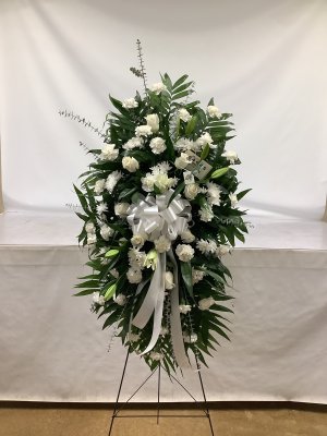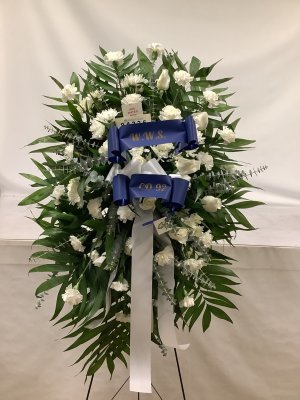 Much prettier in person. It looked stunning right behind his casket . Thanks for making the requested white bow with the silver lettering. It was perfect