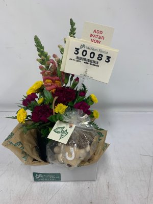 Appreciate the photo prior to the delivery! My husband is enjoying his snack gift & more especially the 65 Mustang with the beautiful flowers! Thanks Again for another order well done!!