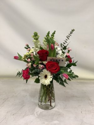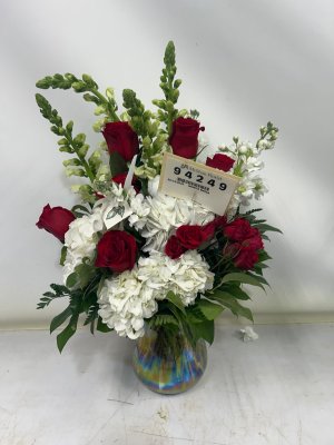 My Valentine's Day red roses and white snap dragons with greenery are beautiful. The delivery guy was cheerful even in the pouring rain.