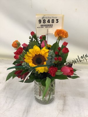 Beautifully done and timely delivered on short notice. I will definitely order from McShan again. The photo of the arrangement was ideal because I could show the order to my husband.