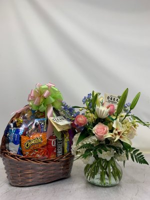 Flowers beautiful!!! Basket of goodies a treat and good selection.