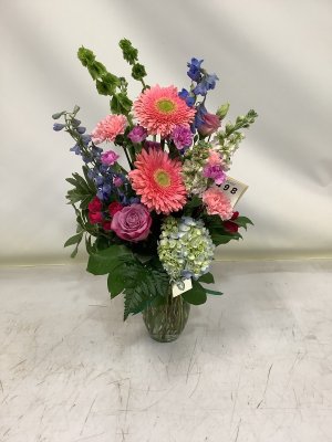 Pretty, I do love getting these flowers. I was hoping the delphinium would be more present, but I understand you might not have them readily available.