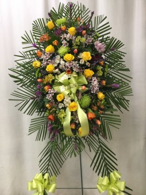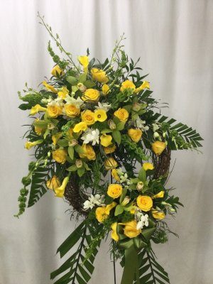 Ok but bow could have been much Much better Looked more like a piece of rope And arrangement could have been more even. Flowers are nice