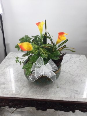 Calla Lillies were in the sample on your web site I don't see any here Fast delivery and the pot that I chose were great.