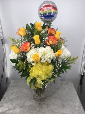 I do not like tiny rainbow balloon- woild like larger balloon. Also, no filler and need two more hydrangeas...and do not like yellow bow. Also supposed to be a dozen yellow amd half dozen orange snd change bow and vase