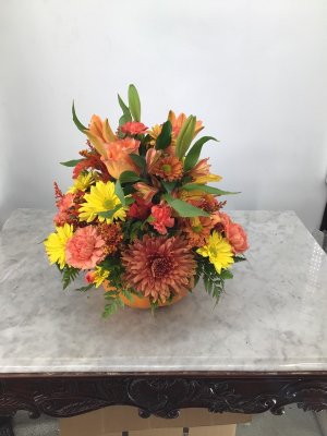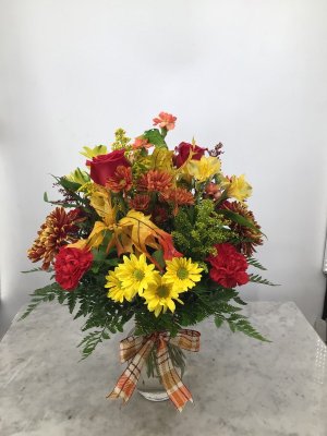 Beautiful holiday arrangement....vibrant fall colors and adorable turkey vase...very reasonably priced as well.