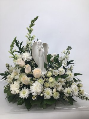That is simply a beautiful work of art. My niece will be surprised thank you and your staff for an outstanding arrangement the flowers and angel are beautiful and bloon. Thank you soo much God bless everyone at Moravian Florist. ๐๐๐