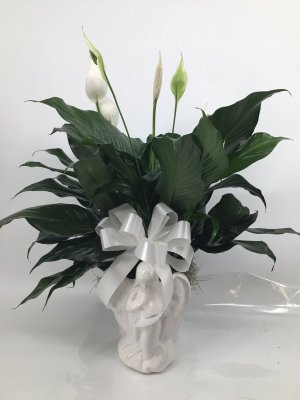 I love the plant and beautiful white bow. I apologize that I did not get the name, but the Moravian representative was vey helpful and kind. She also expressed her condolences which was so nice.