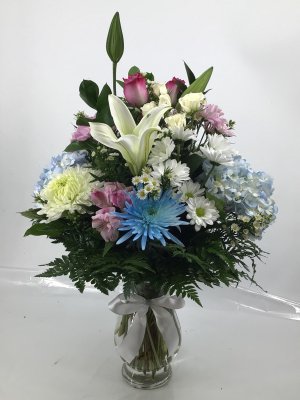 This is beautiful. It is wonderful to receive a photo of our arrangement. I don't know of any florist who offers the same service. This is why I have continued to be a customer for over 40 years.