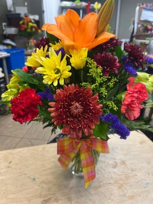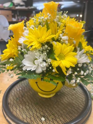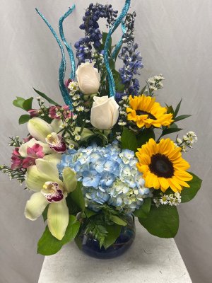 This piece was perfect! I was there when it was delivered and the recipient was thrilled. Loved the yellow in it and the size was ideal. They could not thank me enough. So thank you Moravian Florist for a job well done. And yes getting these photos is a definite plus!