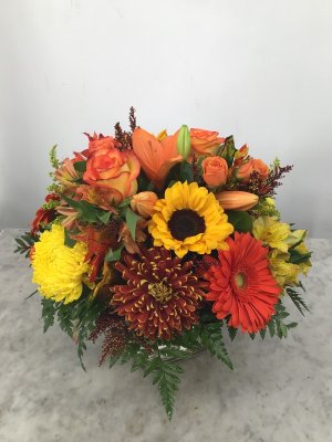 This piece was perfect! I was there when it was delivered and the recipient was thrilled. Loved the yellow in it and the size was ideal. They could not thank me enough. So thank you Moravian Florist for a job well done. And yes getting these photos is a definite plus!
