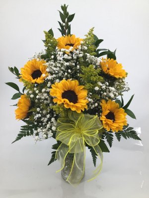 Surprised by addition of pink flowers in an all yellow arrangement. Otherwise beautiful.