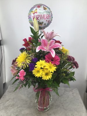 I do not like tiny rainbow balloon- woild like larger balloon. Also, no filler and need two more hydrangeas...and do not like yellow bow. Also supposed to be a dozen yellow amd half dozen orange snd change bow and vase