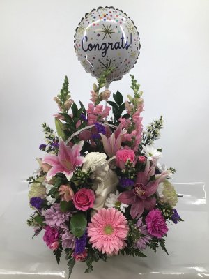 That is simply a beautiful work of art. My niece will be surprised thank you and your staff for an outstanding arrangement the flowers and angel are beautiful and bloon. Thank you soo much God bless everyone at Moravian Florist. ๐๐๐