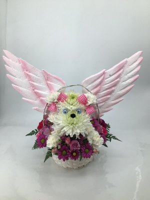 I am very sorry but this arrangement is not at all what I expected this arrangement costs a lot of money. The wings are terrible and the dogs face looks scary. I had sent this for my sister because her dog passed away. She was actually taken back by the arrangement. Please advise what my options are moving forward.