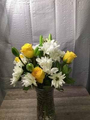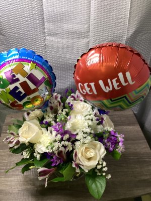 Flowers were pretty, didn't really care for the coordination of the balloons and delivery. Let front door, didn't ring or knock. Placed on ground for me to pick up after hernia surgery…