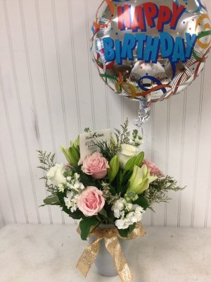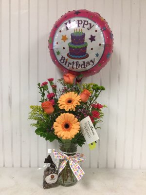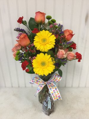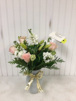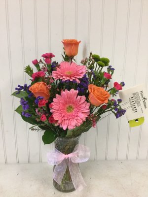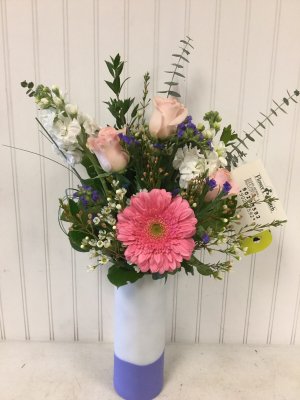 The flower arrangement looks great...would liked to have been given the option between pink and blue vase. I would have preferred pink. I especially love that you have taken a photo of the arrangement and shared with me.