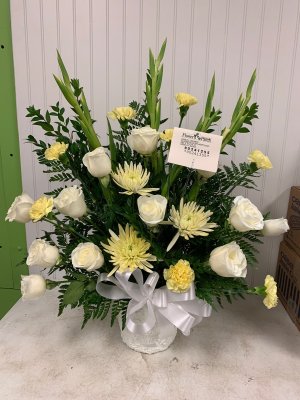 Love getting the photo! That's always tricky with floral delivery when you don't get to see it. Ita beautiful but I am really disappointed that it looks white and ivory rather than white and yellow. I chose this arrangement with the yellow as a representation of her brightness in this life. I know the tall back yellow flowers will open but the viewing is tomorrow so the timing won't allow them to open before services. As well the included flowers aren't anywhere the color represented online. It's just a sensitive situation because perhaps I have too much pressure on the situation that I'm sending flowers to express my sympathy since I can't attend the services.