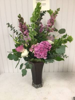 We were very unhappy with the arrangement. The White large flowers were yellow and the pinks were dusty and dark. The whole arrangement looked dark and crowded.