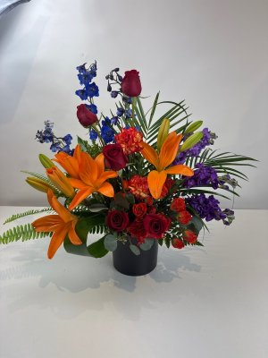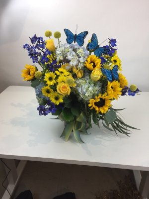I'm very pleased with the beautiful custom arrangement that I ordered. After they sent a picture to me of the finished arrangement, I requested that I wanted more blue flowers than yellow. They were kind and patient and didn't mind switching things around to please me. I was happy too, that they were generous in including 3 butterflies to liven things up! Thank you for allowing our family to be beautifully represented at the funeral of our dear friend, when we weren't able to be there!!