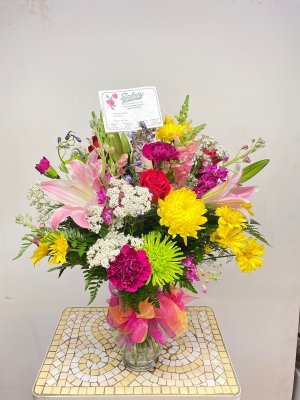 Sympathy arrangement looked beautiful in the photo. Recipient loved it, particularly the cardinal theme as a symbol of her recently deceased brother being spiritually close by. Arrangement a little expensive, but I was spoiled decades by having a best friend as a florist (who recommended Salvy)so assuming price comparable to other good florists. Service prompt and professional. Would definitely use your services again.