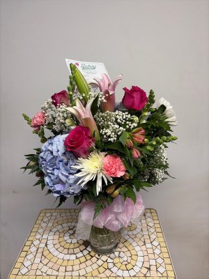 Absolutely beautiful flowers. Perfect arrangement. This was ordered online to be sent to a friend to cheer her up. Purple is her favorite color so added bonus for that, with the purple vase. My family has used Salvy the Florist since forever. They did my wedding flowers years and years ago. I live in Myrtle Beach now but I knew who to reach out to to send flowers to Saugus. Thank you so very much for your attention to detail, (sending a text message with the picture of the flowers that were sent) your promptness, and the beautiful bouquet. Thank you so much!